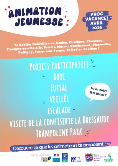 À partir du lundi 13 jusqu'au vendredi 24 avril, les anims ados proposent aux jeunes de 11 à 18 ans des communes de Bainville-sur-Madon, Chaligny, Chavigny, Flavigny-sur-Moselle, Frolois, Maron, Marthemont, Pierreville, Pulligny, Sexey-aux-Forges, Thélod et Xeuilley de nombreuses activités : projets participatifs, boxe, futsal, veillée, escalade, visite de la confiserie la Bressaude, trampoline park !