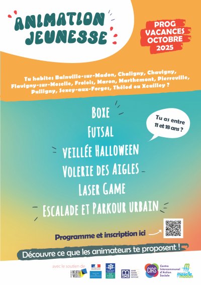 À partir du lundi 20 jusqu'au vendredi 31 octobre, les anims ados proposent aux jeunes de 11 à 18 ans des communes de Bainville-sur-Madon, Chaligny, Chavigny, Flavigny-sur-Moselle, Frolois, Maron, Marthemont, Pierreville, Pulligny, Sexey-aux-Forges, Thélod et Xeuilley de nombreuses activités : Boxe, Futsal, veillée Halloween, Volerie des Aigles, Laser Game , Escalade et Parkour urbain !